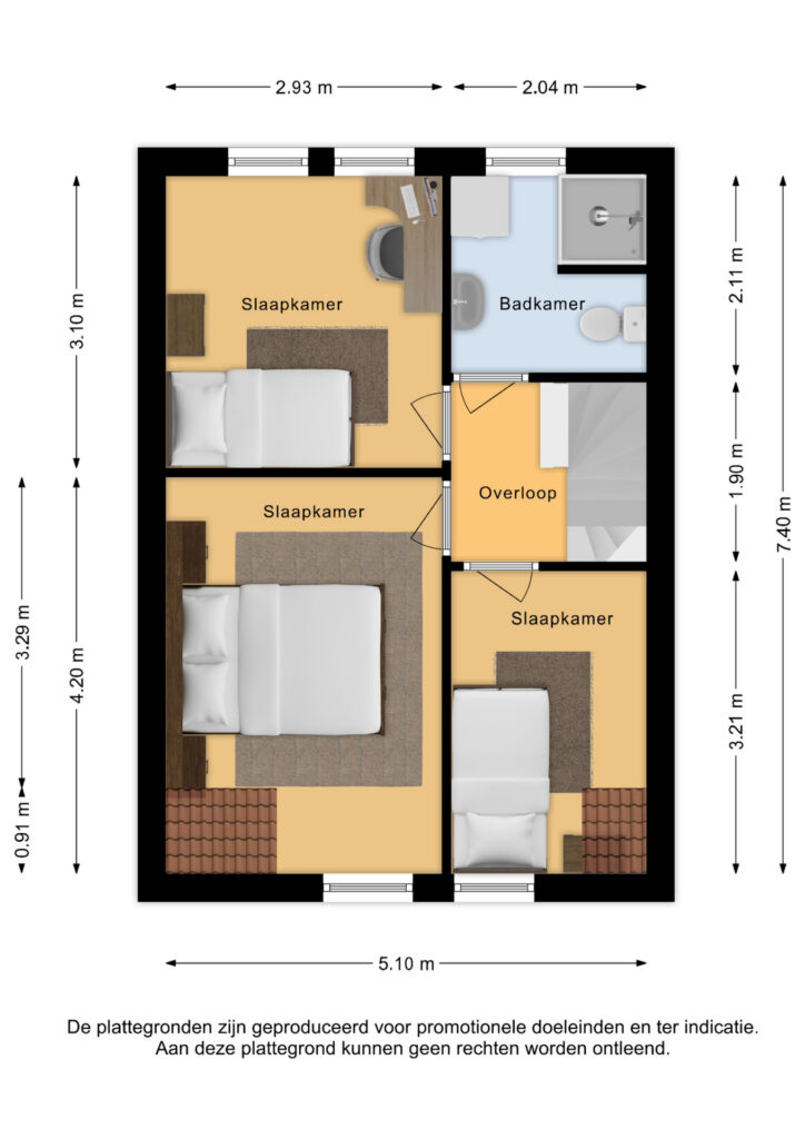 De overloop geeft toegang tot drie slaapkamers en de badkamer. De kamers zijn netjes afgewerkt en beschikken over rechte wanden, wat de indelingsmogelijkheden vergroot. Dankzij de ramen zijn alle kamers licht en prettig in gebruik.