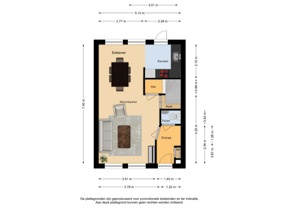 De woning betreed je via de entree met hal, meterkast. Vanuit hier stap je de doorzonwoonkamer binnen. Dankzij de grote raampartijen aan zowel de voor- als achterzijde is deze ruimte aangenaam licht. De woonkamer is praktisch in te delen met een zithoek aan de straatzijde en een eethoek aan de tuinzijde.